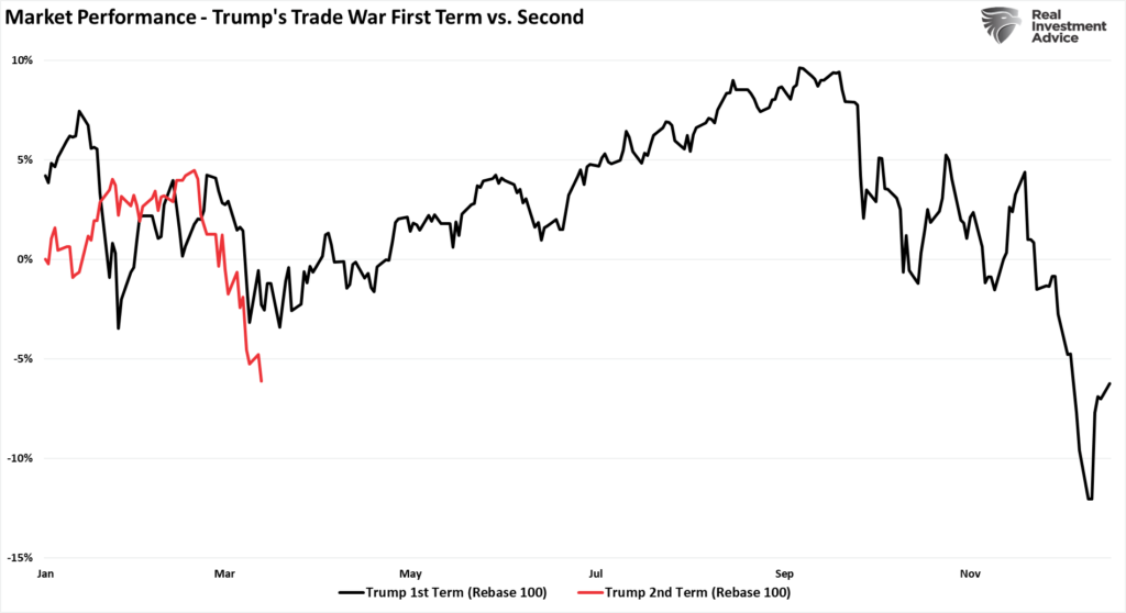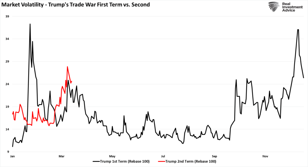 Трампын тарифын асуудал руу дахиад буцъя. Трампын анх ерөнхийлөгч байсан үе, өнөөгийнхтэй нь харьцуулвал энэ удаа л ганцхан унаад байгаа биш бөгөөд харин ч их төстэй хөдөлгөөн орж ирсэн болохыг доорх чартнуудаас харж болно.