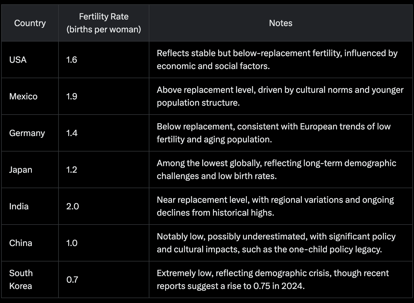 Зарим үзүүлэлтээр бол Герман аль хэдийн зардлаар Америкийг хол давсан бөгөөд хямд болох ямар ч ирээдүй харагдахгүй байна. Хятад, Япон, Солонгосын төрөлтийн хэмжээ маш бага тул ирээдүйд Америкаас ч илүү ажиллах хүчний хомсдолтой болох төлөвтэй. Хүн амын тоо өсөлтгүй зүгээр хэвийн байхын тулд дунджаар 2.1 байх ёстой бөгөөд дээрх орнуудын төрөлтийн хэмжээг харвал өндөр хөгжилтэй орнуудаас Америк хамгийн өндөр 1.6 бөгөөд Солонгос, Япон, Хятадын хувьд нөхцөл байдал маш ноцтой болсныг харж болно.