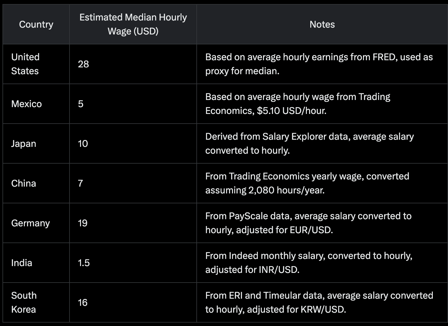 Өнөөг хүртэл Америкт үйлдвэрлээд дэлхийн зах зээл дээр өрсөлдөх боломжгүй болгож байсан гол шалтгаан нь хөдөлмөрийн зардал юм. Дундаж цалингийн хэмжээг чухал үйлдвэрлэгч орнуудтай харьцуулвал: