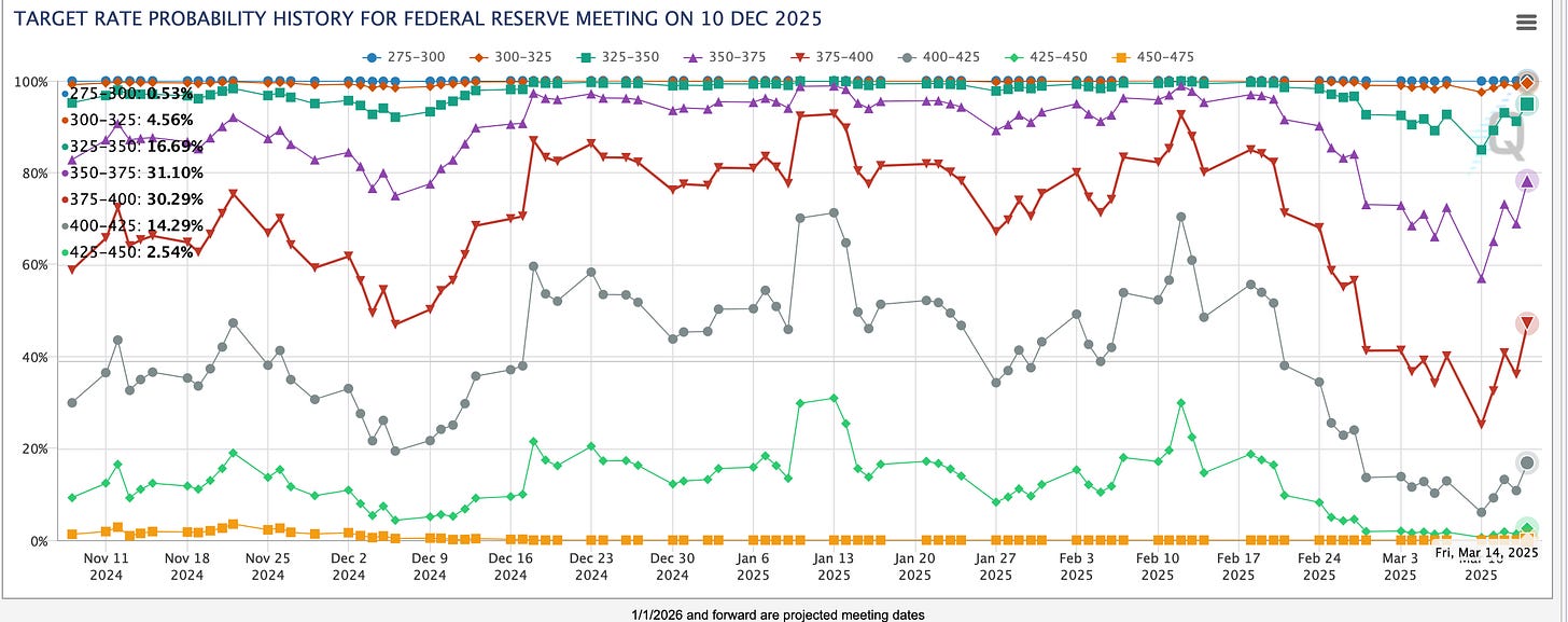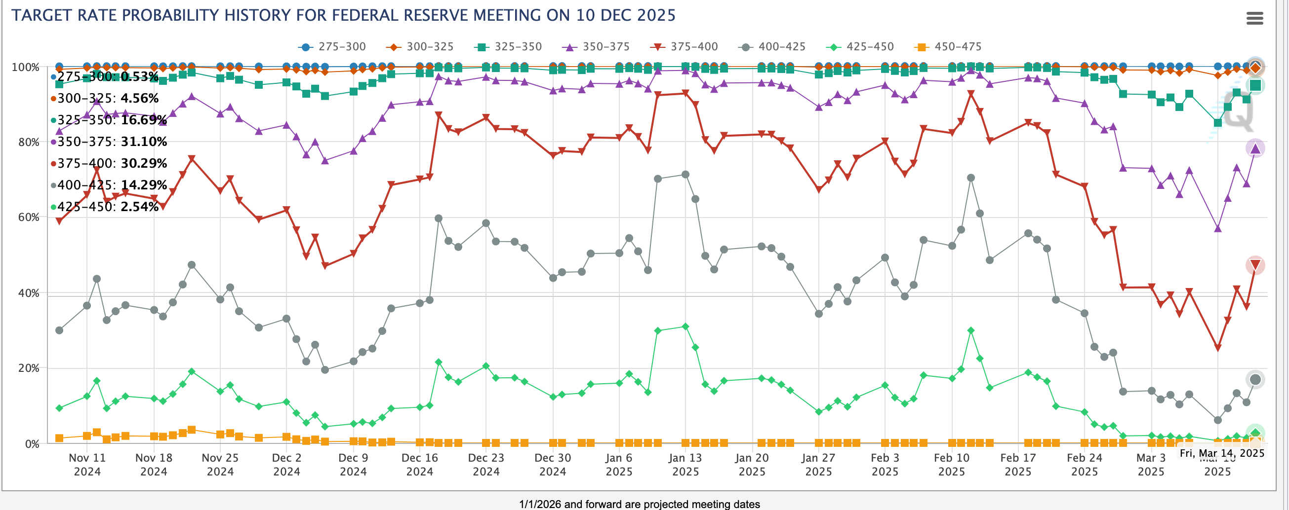 Дараагийн FOMC-ийн хурлаар бодлогын хүүг бууруулахгүй байх магадлал 95% байгаа бөгөөд гол анхаарал нь Холбооны Нөөцийн Сан (Fed) тоон хязгаарлалтыг (QT) түр зогсоох эсэхэд байна.