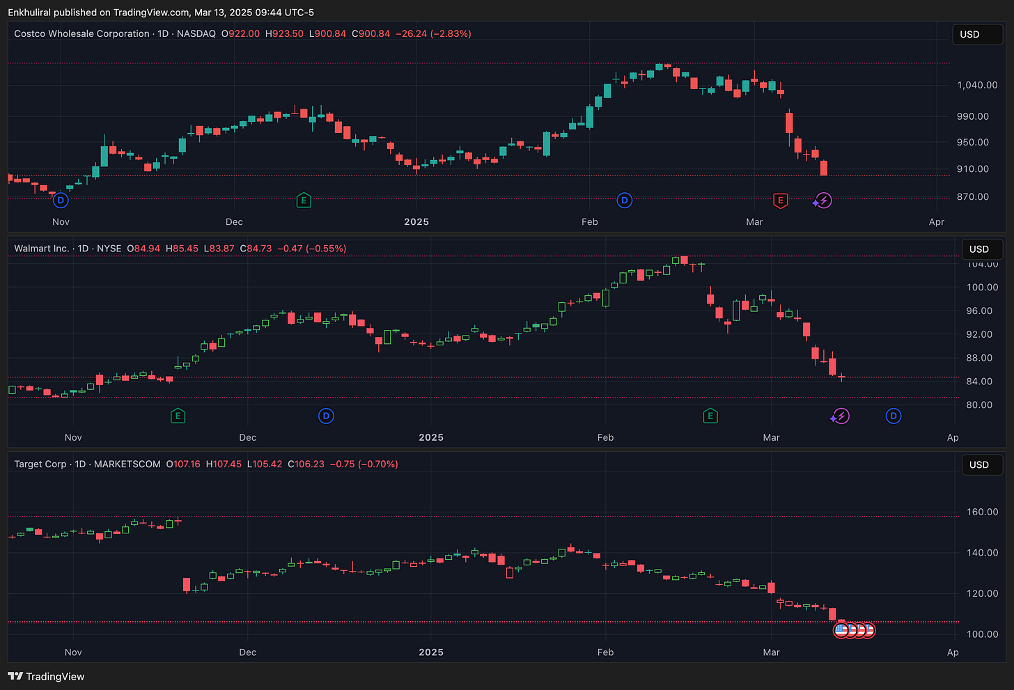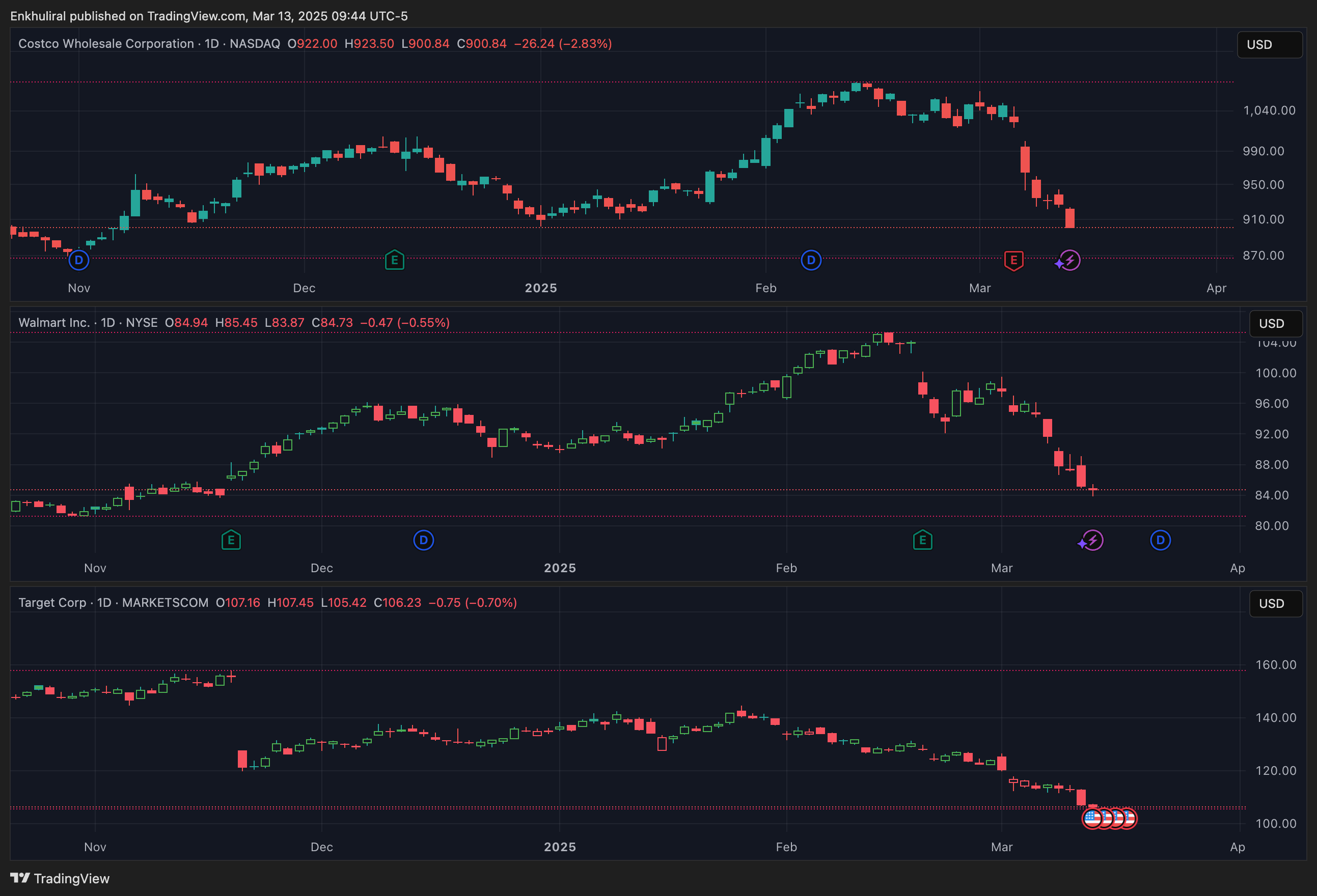 Эгэл иргэдийн санхүүгийн нөхцөл дордсоныг costco, walmart, target-ийн хувьцааны ханш харуулаад байх шиг