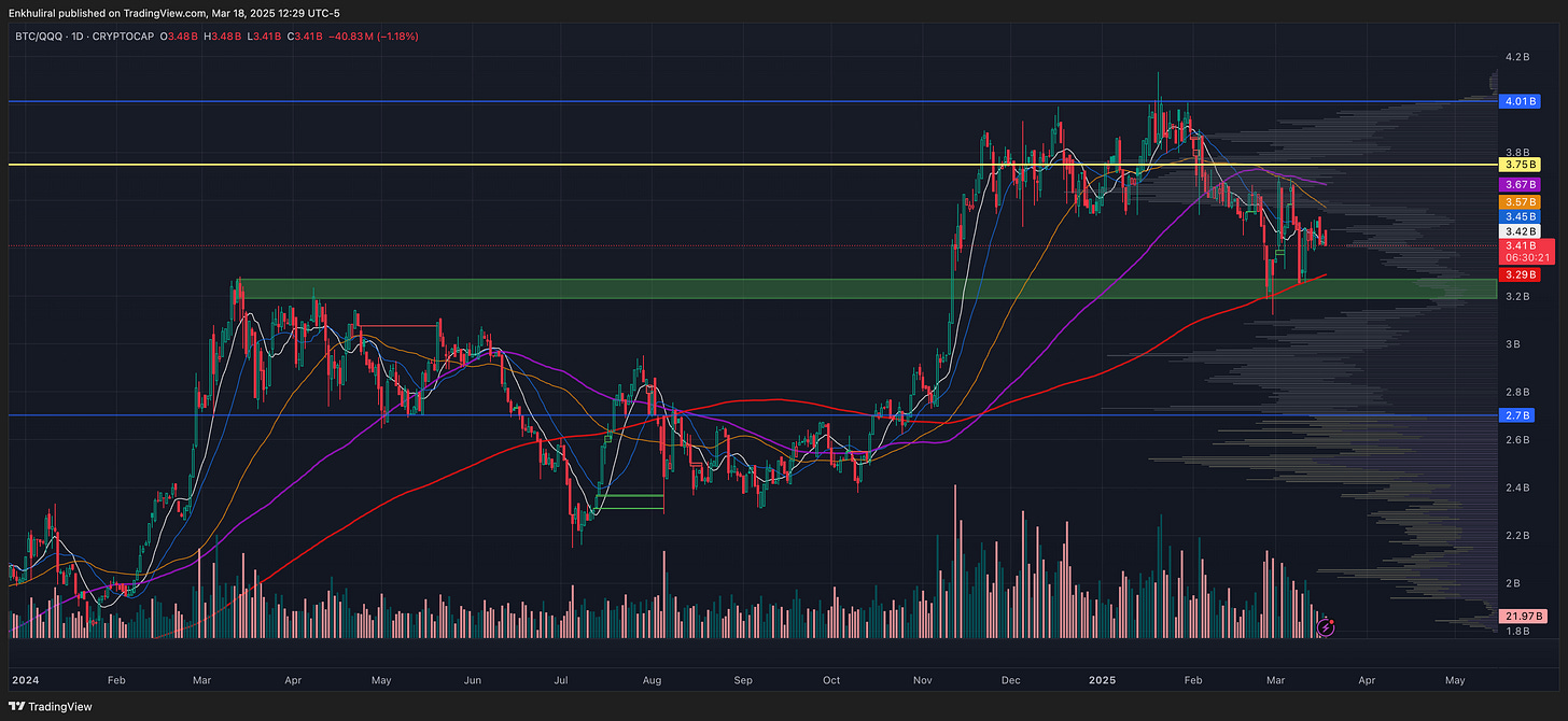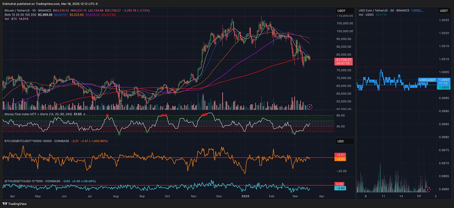 Bitcoin 200 SMA-ийн доор орсон нь техникал талаас нь bearish болгосон. Чартны доор байгаа coinbase premium-ийг харах юм бол ETH-ийг тогтмол хасах хэмжээтэй, Биткойны хувьд үе үе хүчтэй худалдан орж байгааг үл тооцвол тогтмол заралтын дарамт их байгааг харж болно.