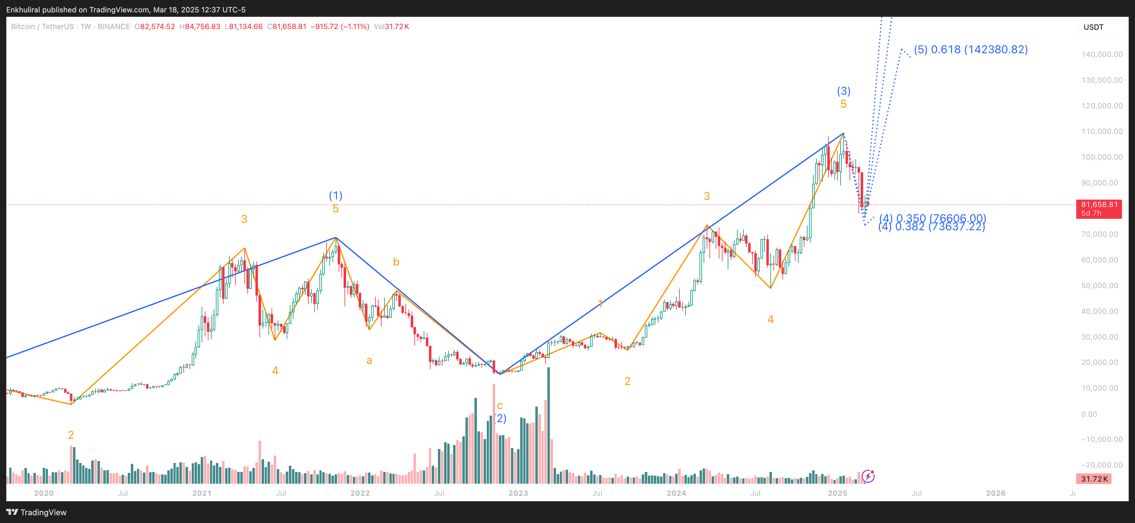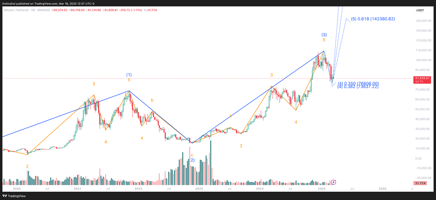Elliott Wave зурвал дараагийн том support $73,000 болон $77,000 дээр байна