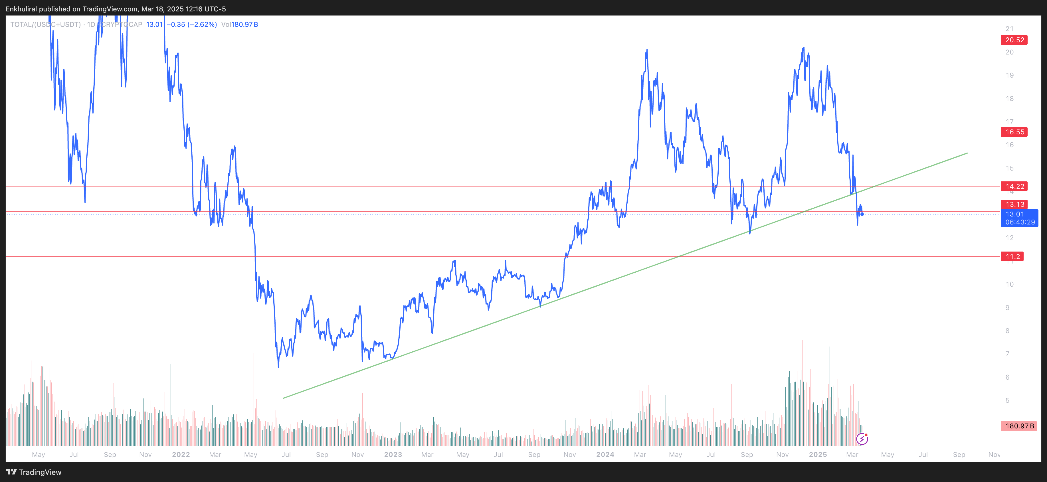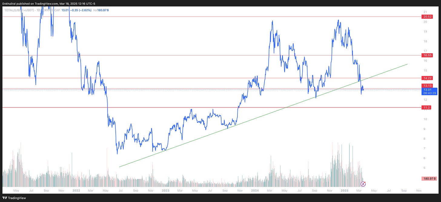 Крипто зах зээл дээрх хамгийн ноцтой чарт энэ байна. 2022 онд эхэлсэн булл маркет дууссан байх магадлал байна.