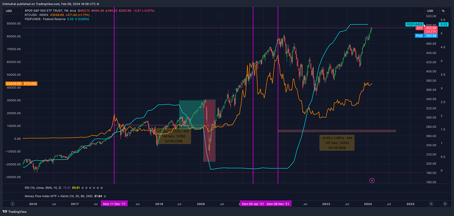 Өмнөх циклээр бодлогын хүүг бууруулсны дараа маркет өссөн ч, Биткойн өсөөгүй бөгөөд Ковидын уналтаар маркетыг дагаж унаад бодлогын хүүг бүр 0 болсны дараа л жинхэнэ булл маркет эхэлсэн байгааг харж болно. Яг энэ давтагдвал 2024 онд Биткойн буцаад all time high дээрээ ирэх магадлалтай.
