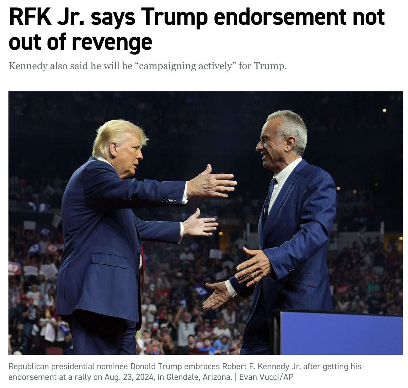 Улс төрийн хамгийн том мэдээ нь RFK Трамптай хүч нэгдэхээр болсон бөгөөд чухал 10 swing state-ээс нэрээ татахаар болсон байна.