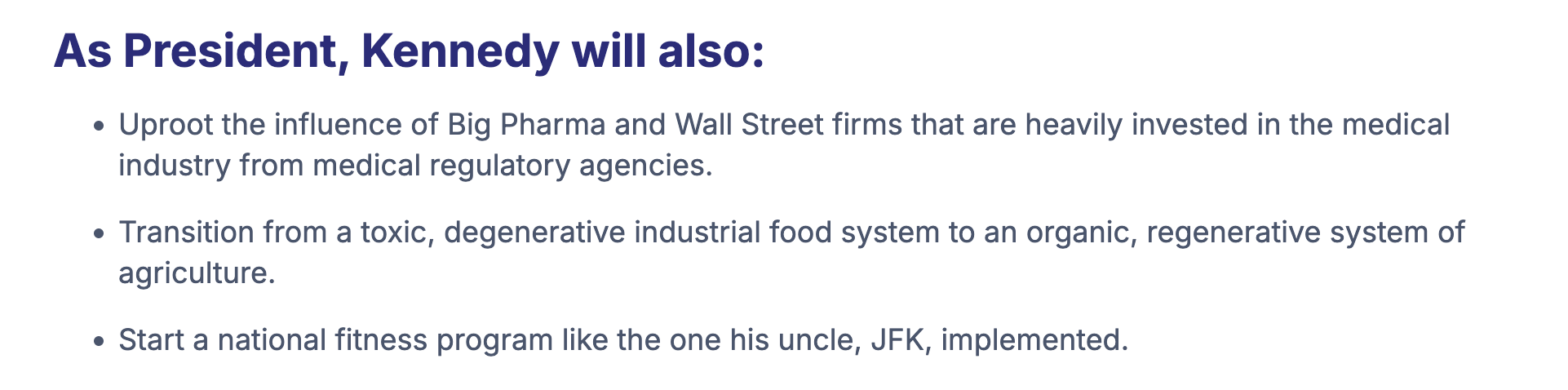 Kennedy Америкын эрүүл мэндийн системд том хувьсал авч ирэхээ зарласан бөгөөд өөрийнх вэб хуудаснаас policy-г нь харвал дараах ажлуудыг дурдсан байна: