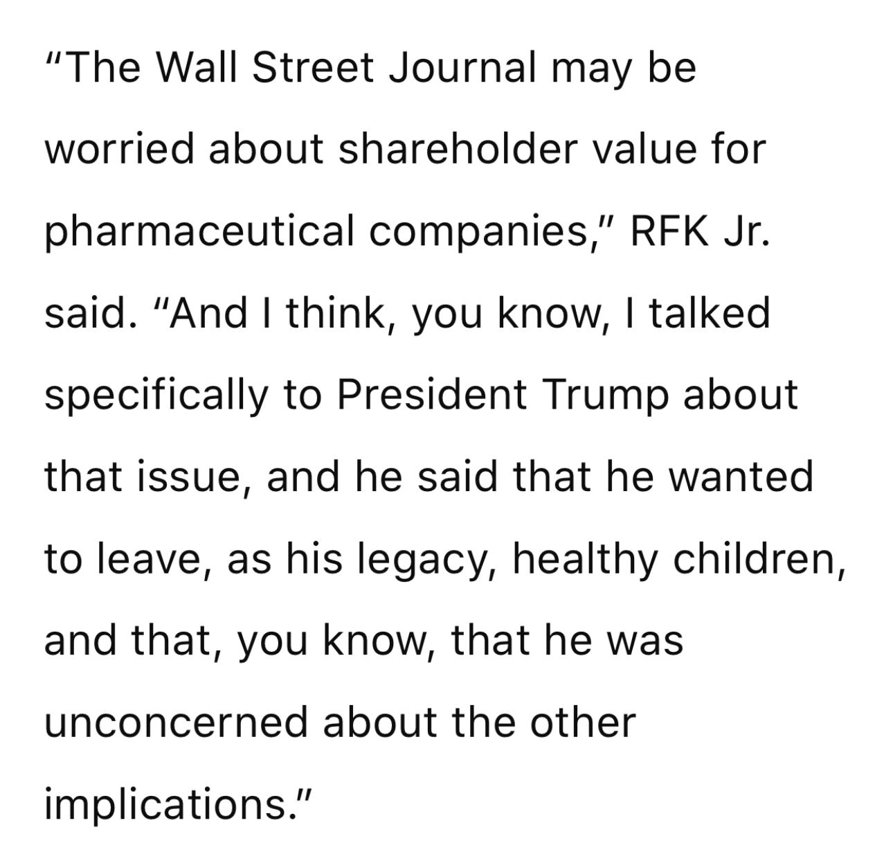 Тэрээр том эмийн компаниудын завхарлыг дуусгаж, боловсруулсан хоол хүнсийг болиулж, хүмүүсийг эрүүл хоол хүнс иддэг болгоно гэдгээ илэрхийлсэн юм. RFK-ээс болоод том эрүүл мэндийн компаниудын хувьцаа унах эрсдэлтэй гэж үзэхэд хүргэж байгаа бөгөөд энэ эрсдлийг үл хамааран Трамп RFK-тай ажиллана гэдгээ илэрхийлсныг доорх артиклд дурджээ.