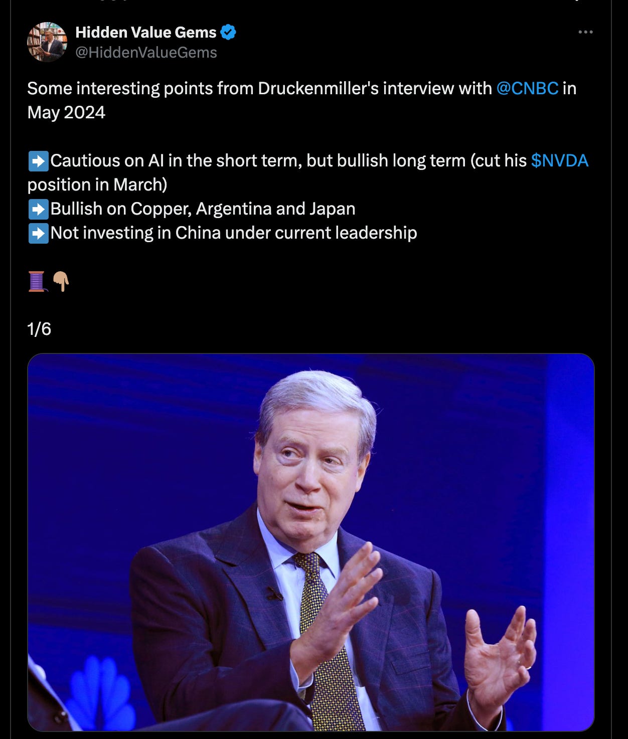 Druckenmiller домогт хөрөнгө оруулагч юу гэснийг энэ товч оруулсан байна. Хятад-д хэзээ ч хөрөнгө оруулалт хийхгүй, зэс дээр буллиш байна гэсэн нь сонирхолтой санагдлаа.