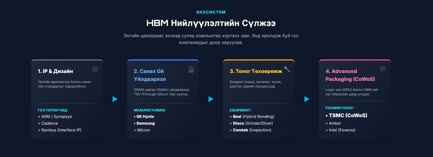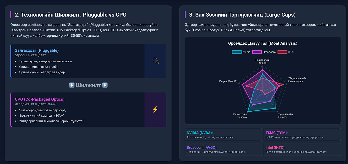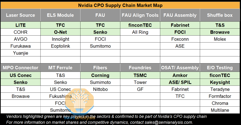 Fabrication талдаа TSM 0.00%↑ тэргүүлж байгаа юм байна. (гайхаад байх юм алга) Switch талдаа бол AVGO 0.00%↑ хамгийн том тоглогч. Pluggable DSP, cable шийдэл дээр Мөлжүүртэй булан дээр санал болгож байсан харамсалтай нь ашгаа эрт авсан хувьцаа CRDO 0.00%↑ билээ. $CRDO-гийн шийдлээс дараагийн төвшний шийдэл нь чиптэйгээ ойрхон лазер суурьлуулах бөгөөд Nvidia-гийн технологийн партнерүүдийг ногооноор тодруулсан хүснэгтийг доороос харж болно.
