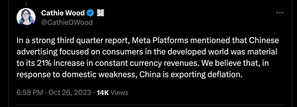 Cathie wood-ийн өөр нэг сонирхолтой бас Мөлжүүртэй булангийн хамт олон (би ганцаараа юм байж хамт олон гэчжээ бас 😝) бас санал нэгдэж байгаа дүгнэлт нь Meta-ийн сүүлд гаргасан улирлын тайлан дээр Хятадаас хөгжингүй орны хэрэглэгчдийг онилсон зарын хэмжээ 21 хувь өссөн нь Хятад гадагшаа Дифляци экспорт хийж байгааг харуулж байна гэсэн дүгнэлт гаргасан байна.
