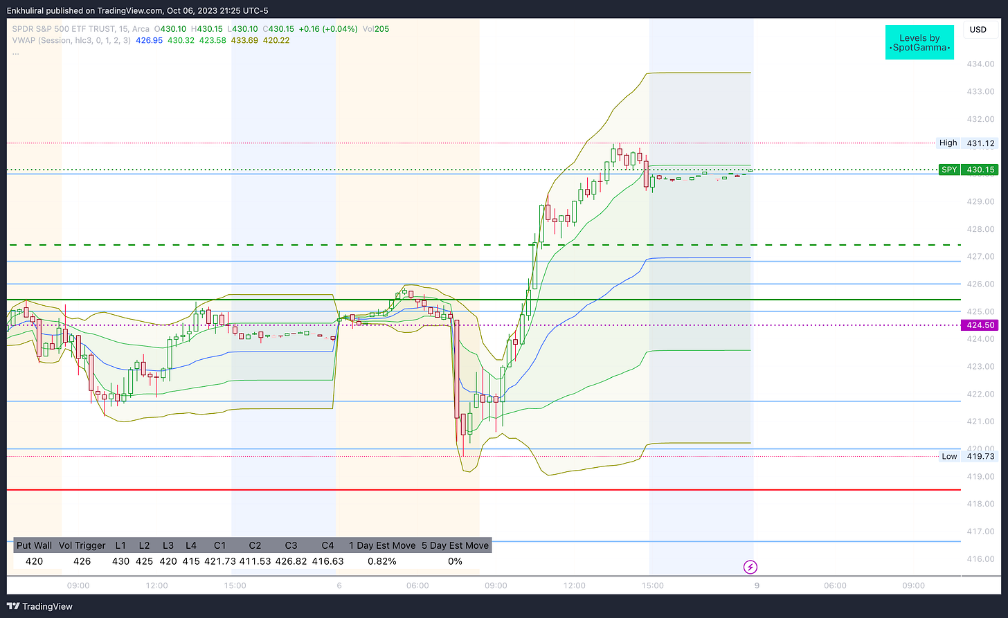 Энэхүү өсөлт олон талаараа чухал 430 дээр байсан том call wall-ийг давсан бөгөөд хамгийн гол нь 426 дээр байсан Volatility Trigger-ийн дээр гарснаар дараа долоо хоногт маркет эерэг гамматай нээгдэх нөхцлийг бүрдүүлсэн.