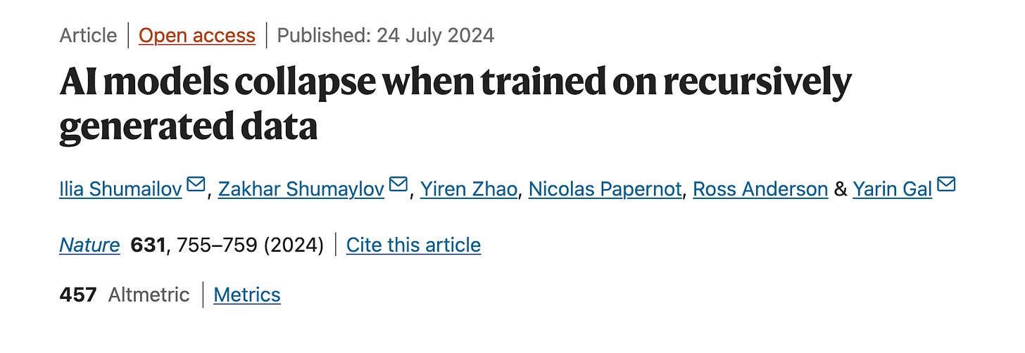 Доорх судалгаа сонирхолтой зүйлийг олж мэдсэн бөгөөд тэр нь хиймэл оюун ухааныг хиймэл оюун ухаанаар боловсруулсан датагаар тэжээх юм бол нэг цэг дээрээс AI модел нь ориг датагаа мартаад энгийндээ галзуурдаг байна. Үүнийг дата science дээр Garbage-in-garbage-out гэдэг. Хог орвол хог гарна гэсэн санаа.