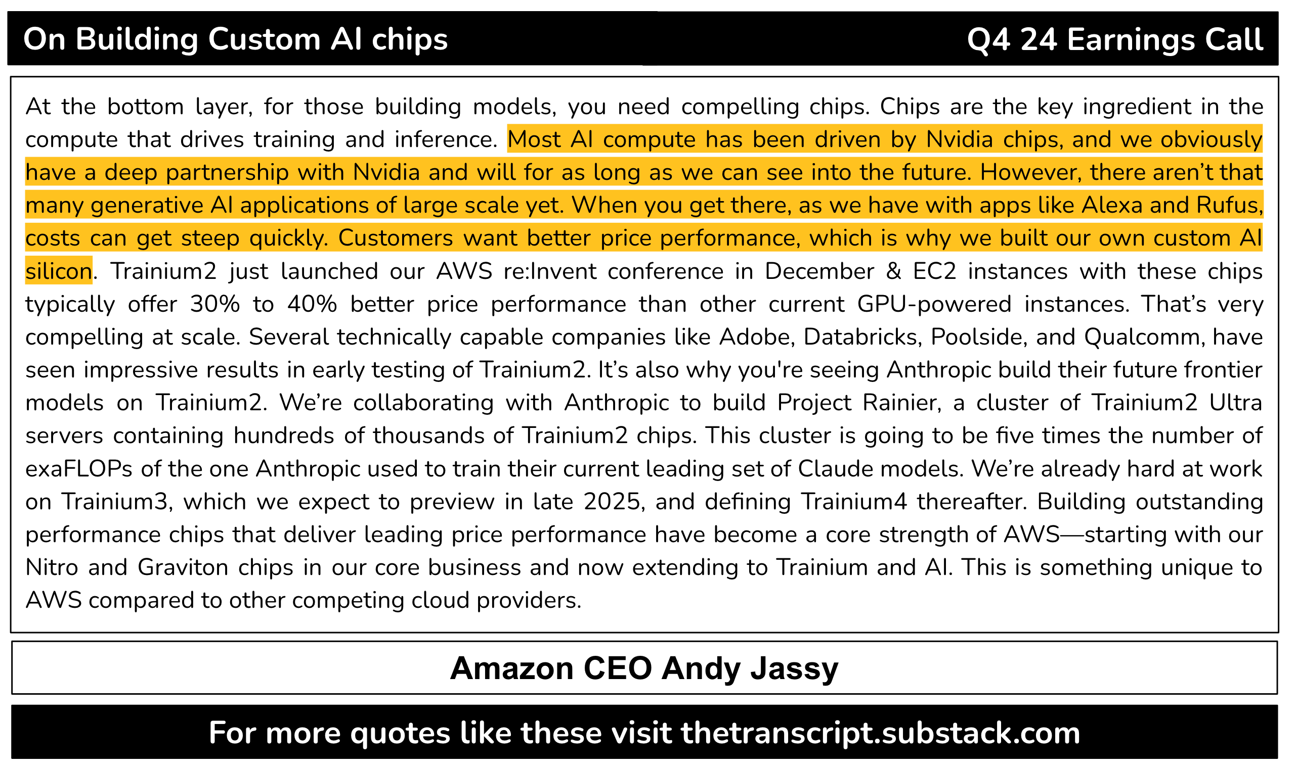 Амазон өөрсдийн гаргасан хагас дамжуулагчийн ачаар 30-40% хэмнэлт бий болгоно гэсэн байна. Цаашдаа энэ нь Nvidia chip-ний эрэлтийг бууруулах эрсдэлтэй: