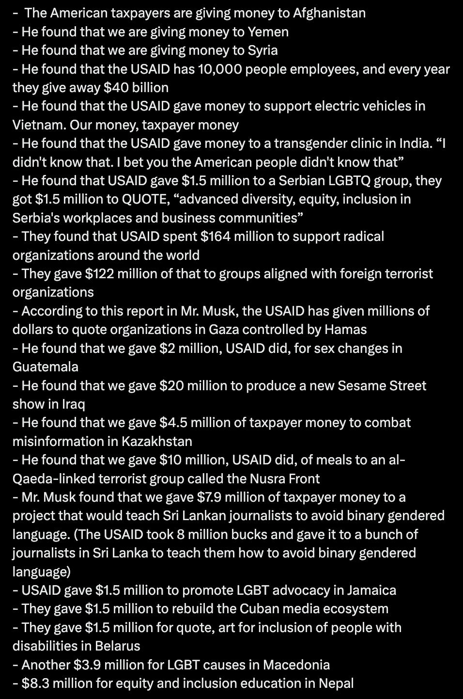 За энэ Олон улсын хөгжлийн агентлагаар дамжуулан хийсэн утгагүй үйлдлүүд, завхарлуудыг тоочиход үнэхээр бэрх ямартай ч хэвлэл мэдээлэллийг гартаа авсан, бохир улс төрчдийг баяжуулсан, террористуудыг санхүүжүүлсэн, Америкт ямар ч холбогдолгүй газруудад хүйс солих мэс заслын санхүүжилтийг гаргасан гээд олон юм байна. Заримаас нь screenshot болгон орууллаа.