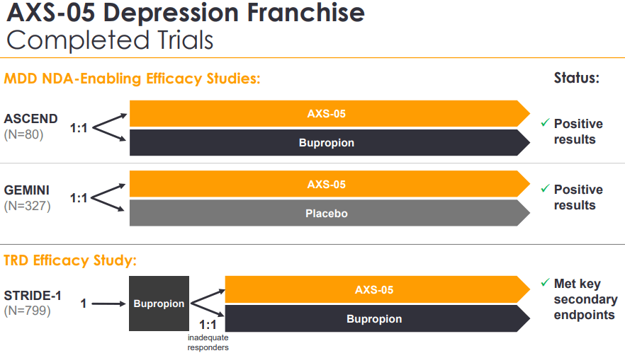 AXSM-ийг онцолж буй бидний гол шалтгаан бол тэдний шинэ бүтээгдэхүүн болох AXS-05-тай холбоотой. Товчхондоо энэ эм нь сэтгэл гутралын эмгэгийг (depressive disorder) эмчлэх хамгийн үр дүнтэй шийдэл болж магадгүй байна. Учир нь AXS-05 3-р шатны туршилтаараа сэтгэл гутралын шинж тэмдгүүд мэдэгдэхүйц буурсан гэх дүгнэлтэд хүрч өвчтөнүүдийн 47% нь AXS-05-ийг хэрэглэснээр мэдэгдэхүйц сайжирсан гэжээ. Ингэснээр AXSM FDA-д хандан өргөдөл гаргаж Priority буюу AXS-05-ийг хянахтай холбоотой үйл явцыг хурдлуулж 10 сар бус 6 сарын хугацаанд шийдвэрлүүлэх боломжтой болж байна.