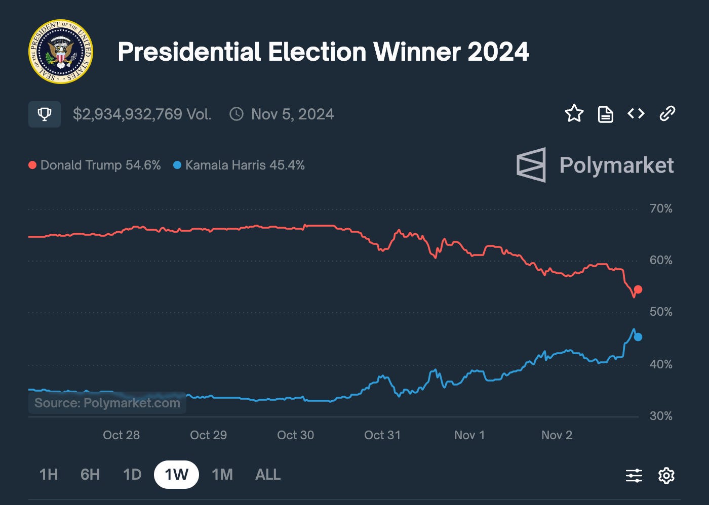 Трамп ялна гэдгийг харуулж болох олон дата байгаа ч гэсэн энэхүү репортыг бичээд сууж байхад Трампын ялах магадлал PolyMarket дээр хүчтэй уналттай байна.
