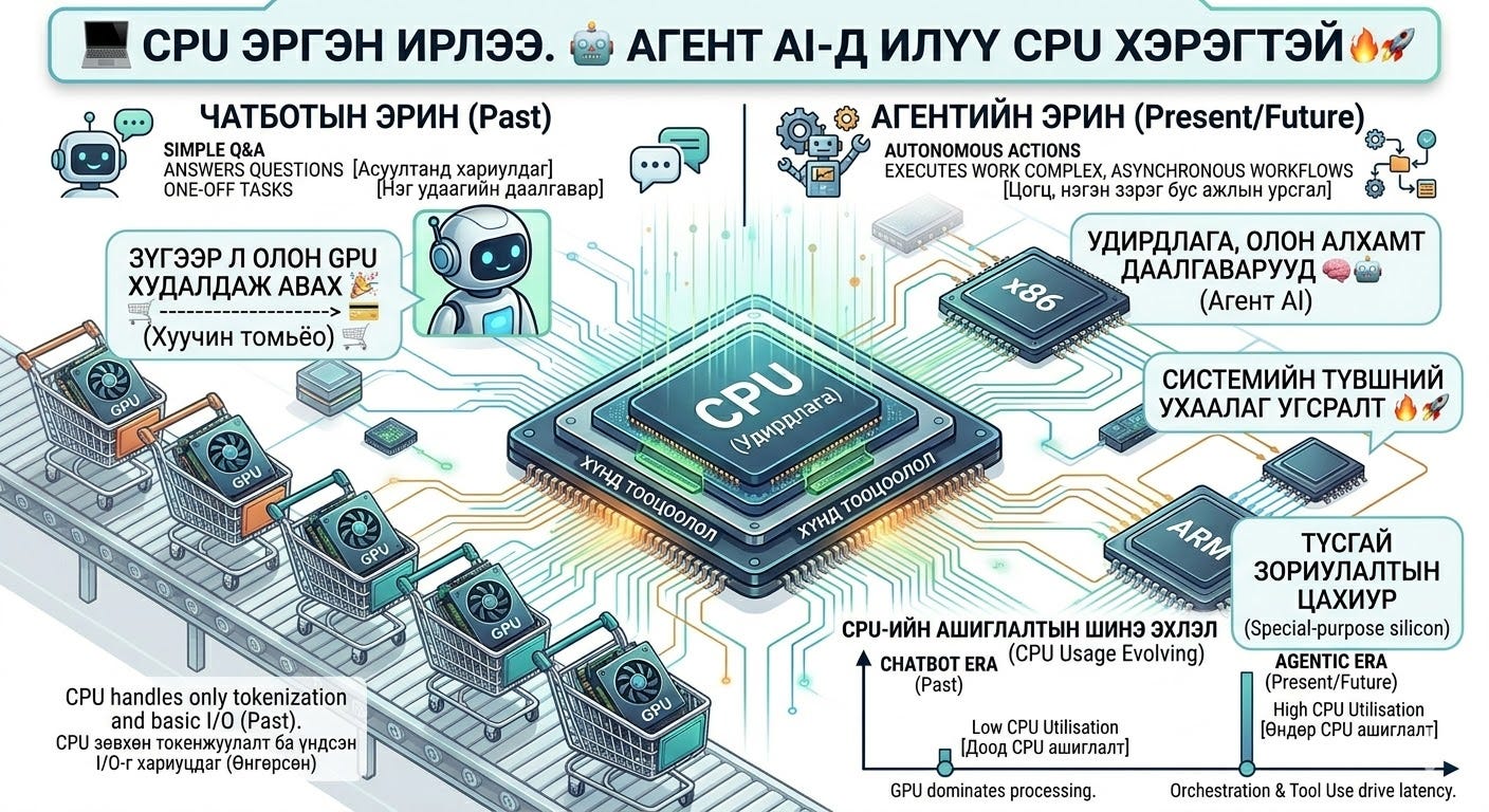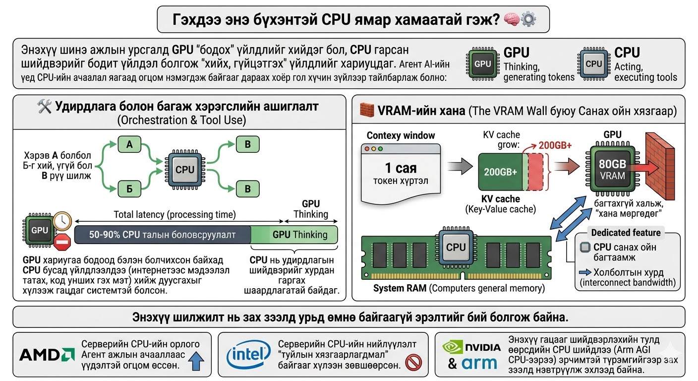 🛠️ Удирдлага болон багаж хэрэгслийн ашиглалт (Orchestration & Tool Use): Агентуудын ажил нь “Хэрэв А болбол Б-г хий, үгүй бол В рүү шилж” гэх мэт дараалсан, салаалсан логик шаарддаг бөгөөд энэ нь CPU-ийн хамгийн сайн хийж чаддаг үндсэн үүрэг юм. CPU нь удирдлагын шийдвэрийг хурдан гаргах шаардлагатай байдаг. Одоогийн зарим агент ажлын ачаалалд, өгөгдөл боловсруулахад зарцуулж буй нийт хугацааны буюу хоцрогдлын (latency) 50-90%-ийг зөвхөн CPU талын боловсруулалт эзэлж байна. Өөрөөр хэлбэл, GPU хариугаа бодоод бэлэн болчихсон байхад CPU бусад үйлдлээ (интернетээс мэдээлэл татах, код унших гэх мэт) хийж дуусгахыг хүлээж гацдаг системтэй болсон.