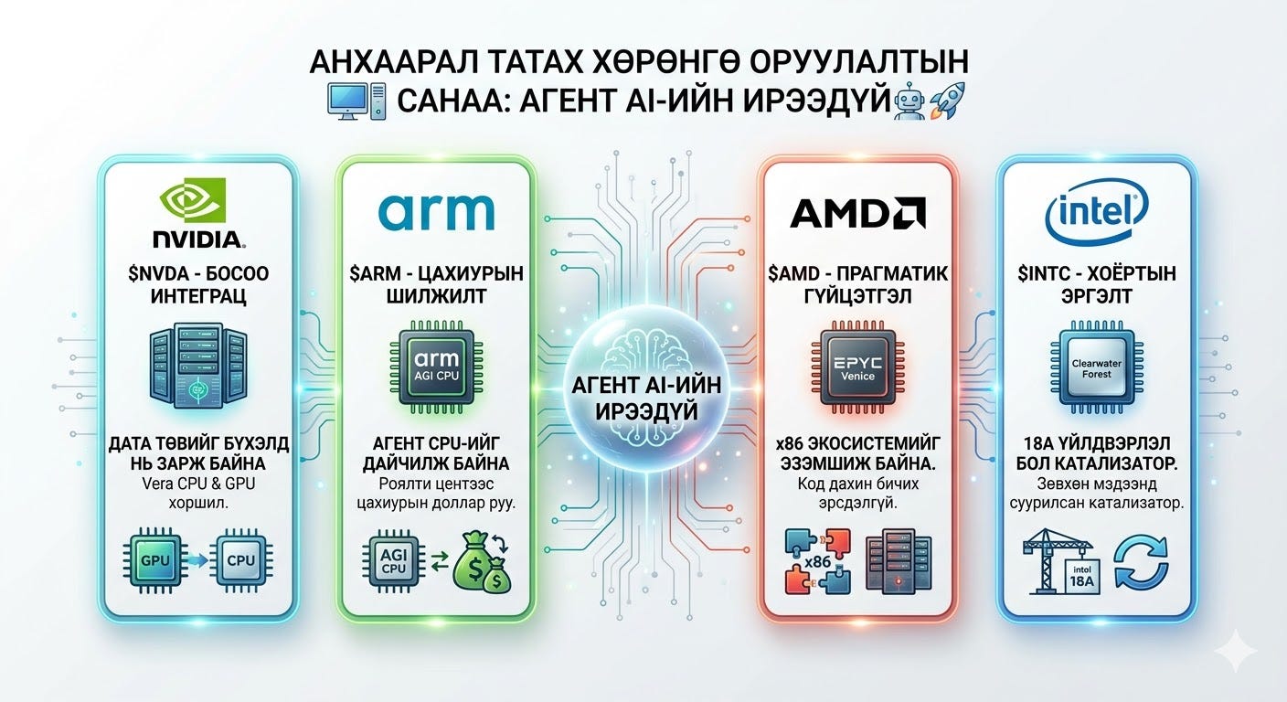 🌪️ Arm AGI CPU (Custom Arm) — Хараат бус байдал ба Зах зээлийг эвдэгч: Өмнөх хэсэгт дурдсан гайхалтай эрчим хүчний хэмнэлтээс гадна, энэхүү чипийн хамгийн чухал стратегийн үнэ цэн нь “Аврах цагираг” болж байгаад оршино. Томоохон үүлэн үйлчилгээ үзүүлэгчид (Hyperscalers) зөвхөн нэг нийлүүлэгчийн хаалттай экосистемд (Vendor lock-in) орохыг огт хүсэхгүй байгаа. Arm өөрийн цахиурыг шууд нийлүүлж эхэлсэн нь худалдан авагчдад архитектурын эрх чөлөөг олгож, x86-ийн ноёрхлыг өртөг болон эрчим хүчний хэмнэлт гэсэн хоёр фронтоор нэгэн зэрэг цохиж байна.