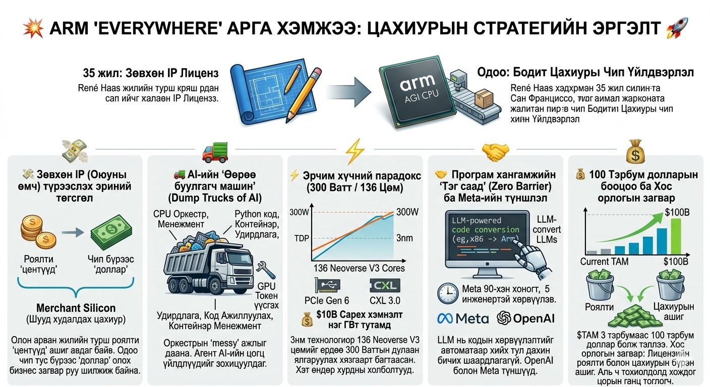 🤝 4. Програм хангамжийн “Тэг саад” (Zero Barrier) ба Meta-ийн түншлэл: Өмнө нь дата төвүүд Arm руу шилжихэд хамгийн том саад нь бүх кодыг дахин бичих буюу “програм хангамжийн татвар” (Software tax - шинэ архитектур руу шилжихэд гардаг нэмэлт зардал, хүндрэл) байлаа. Гэтэл энэ саад одоо бараг “тэг” болсон. Meta компани 90-хэн хоногийн дотор ердөө 5 инженертэйгээр өөрсдийн системийг Arm руу бүрэн хөрвүүлж чадсан байна. Нууц нь юу вэ? LLM (Том хэлний загвар) нь кодын хөрвүүлэлтийг автоматаар хийж, хүмүүс гараар код бичих шаардлагагүй болжээ. Meta болон OpenAI нь энэхүү шинэ CPU-ийн хамгийн гол стратегийн түншүүд болж байна.