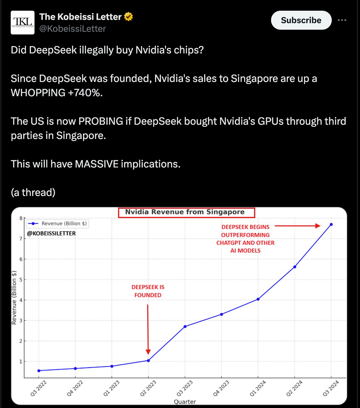 Deepseek худалдааны хориг үл хамааран тэрбумаар үнэлэгдэх Nvidia чиптэй байж таарсан билээ. Тэгвэл Сингапураар дамжуулж эдгээр худалдан авалтыг хийдэг байж болохыг илрүүлсэн thread-ийг хуваалцъя.