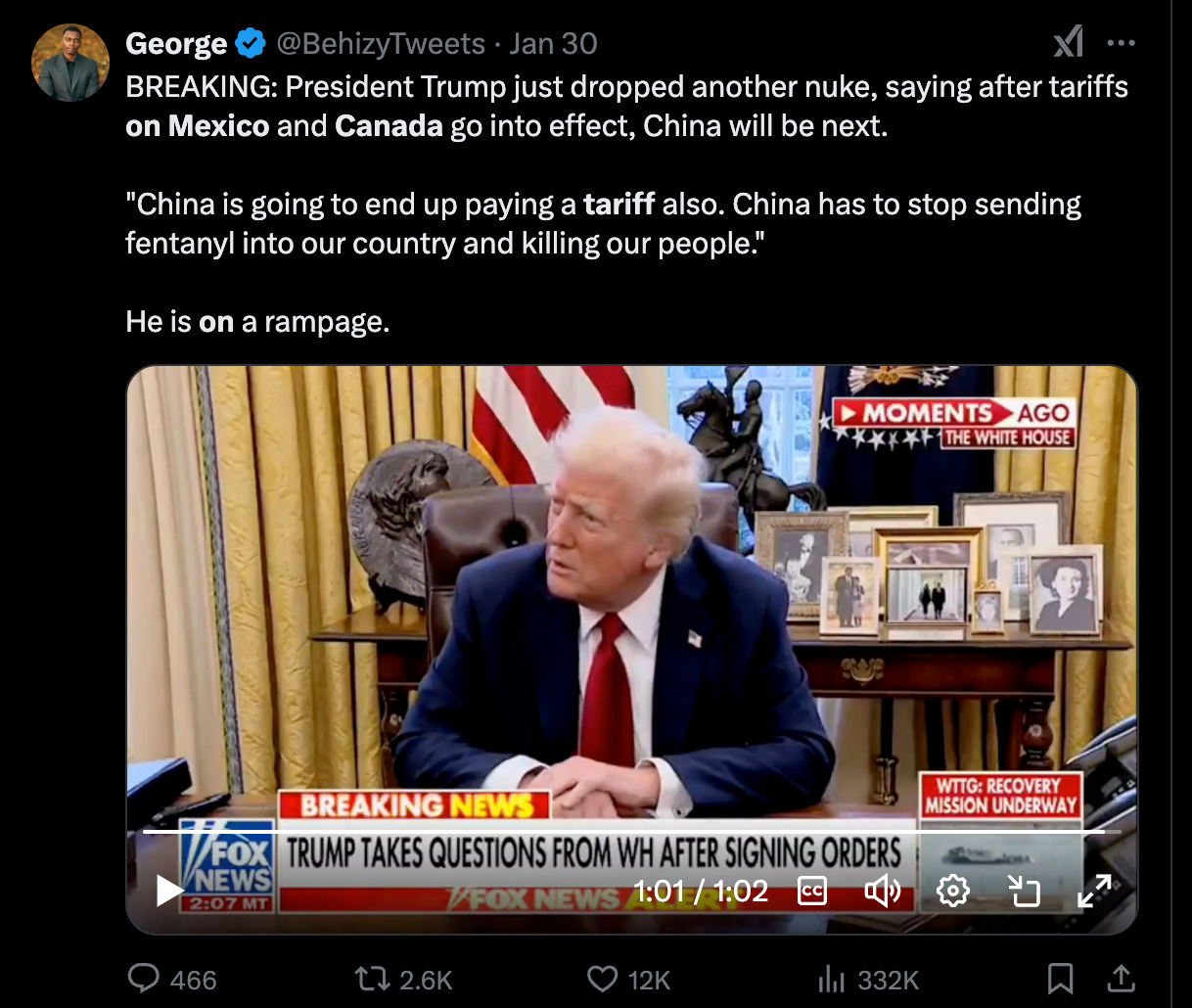 Kash Patel, RFK, Tulsi Gabbard сонсгол, ISIS руу хийсэн дайралтаас гадна маркетад хүчтэй нөлөөлөх 5 дахь өдрийн уналттай холбоотой байж болох мэдээ нь Канад, Мексик, Хятадад шинээр ногдуулах гэж буй татвар юм.