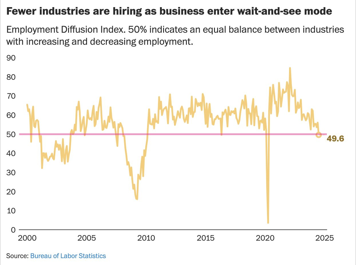 Ажилгүйдэлтэй холбоотой датаг харуулаад, 250 industry-г нэгтгэсэн Diffusion index гэж үзүүлэлт байдаг юм байна. Энэхүү үзүүлэлт 20-оноос хойш анх удаа 50-ийн доор орсон байна.