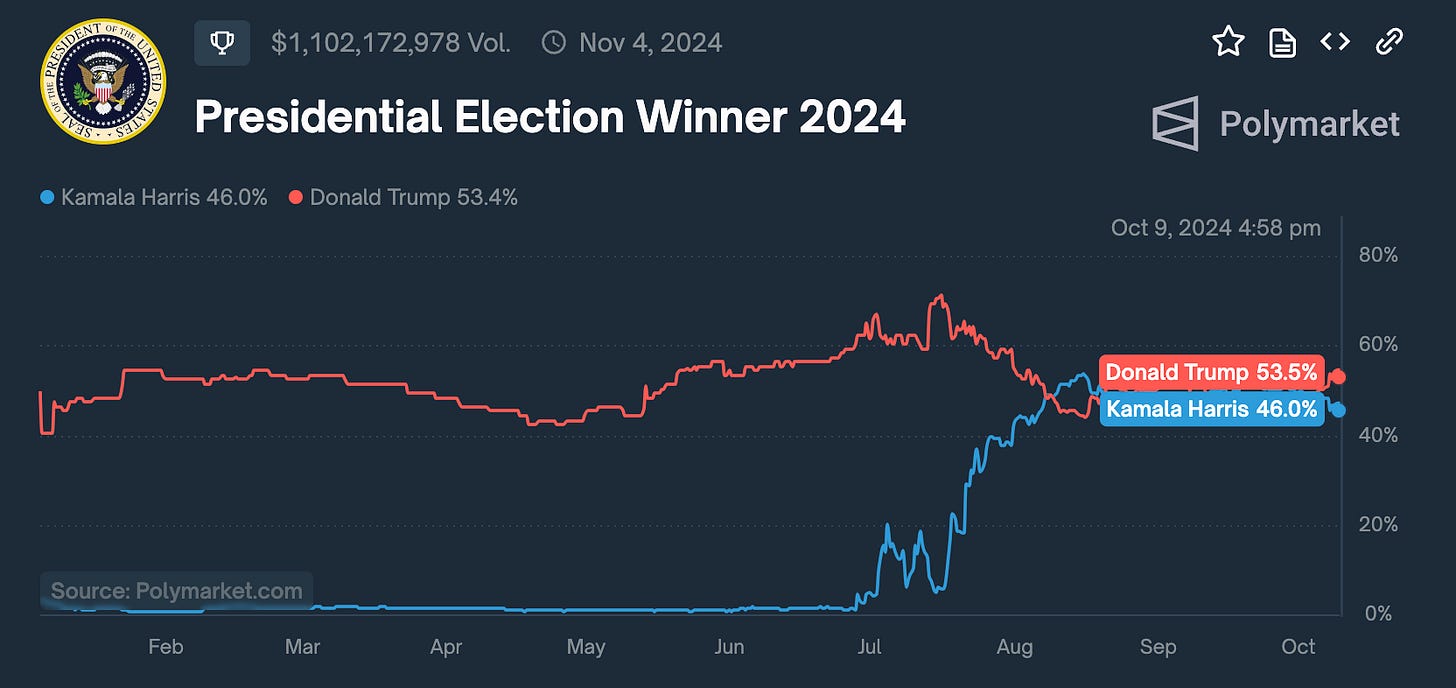 Trump ялах магадлал 53.5% хувь гэж маркет үзэж байна. 46% байхад нь мөлжүүртэй булан санал болгосон билээ.