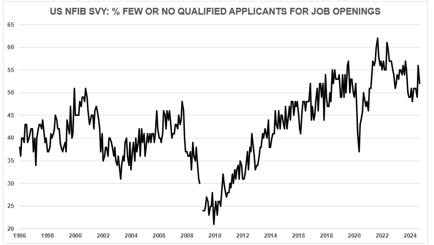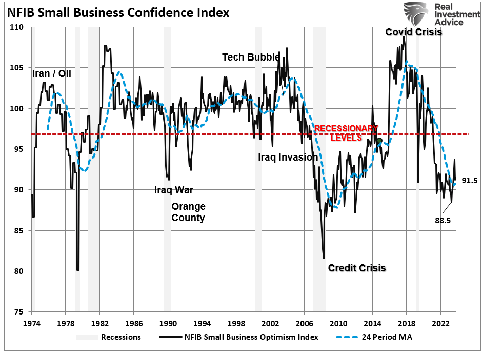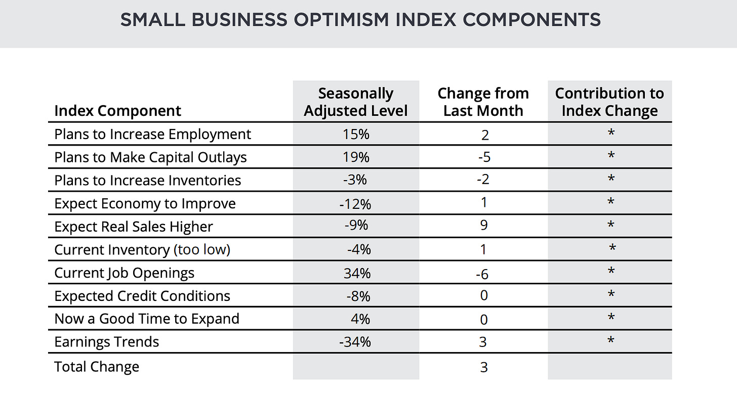Хэдийгээр Wall Street-ийн өөдрөг үзэл бодол итгэл төрүүлж байгаа ч, NFIB-ийн Жижиг Бизнесийн Өөдрөг Байдлын Индексийн сүүлийн үеийн мэдээлэл эсрэг дүр зургийг харуулж байна. Жижиг бизнесүүд бол АНУ-ын эдийн засгийн тулгуур багана бөгөөд NFIB-ийн судалгаагаар гарсан үзэл бодол нь Main Street-ийн тулгарч буй сорилтуудын талаар илүү нарийвчилсан ойлголт өгдөг. Энэ нь ихэвчлэн Wall Street-ийн өргөн хүрээний хэтийн төлөвөөс зөрдөг. Тус индекс нь эдийн засгийн өргөжилт бус харин эдийн засгийн агшилттай илүү холбоотой түвшинд байсаар байна.