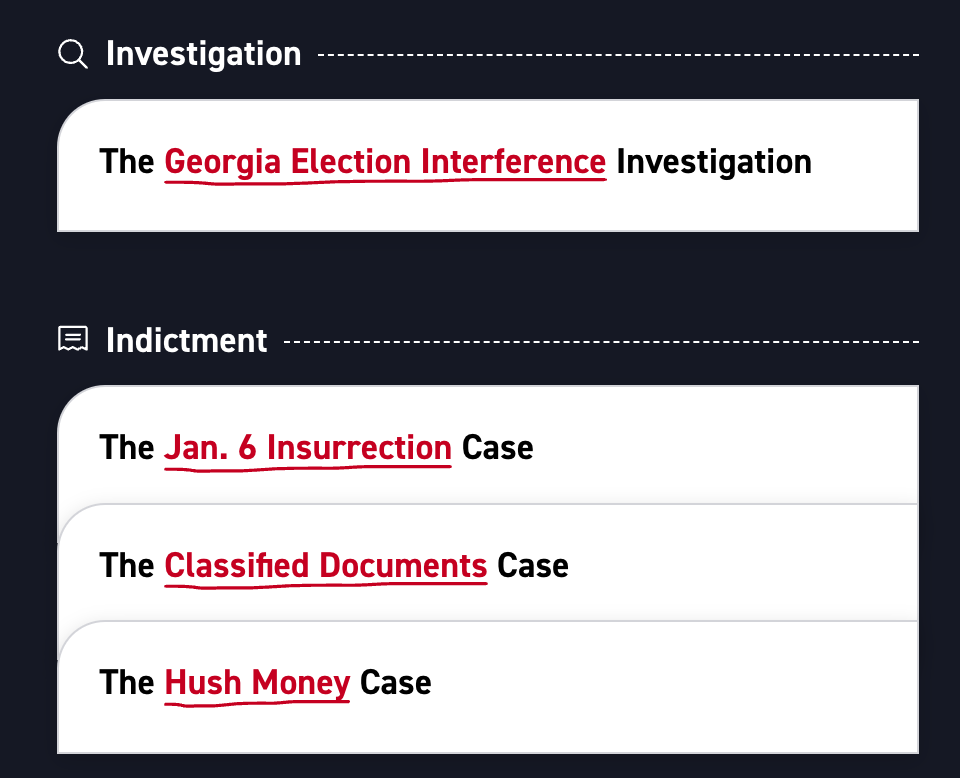 Америкийн түүхэнд анх удаагаа Ерөнхийлөгч байсан хүнийг хэрэгт буруутгасан (indictment) тохиолдол гарсан бөгөөд Трампын дараах кэйсүүд явж байгаа юм байна: