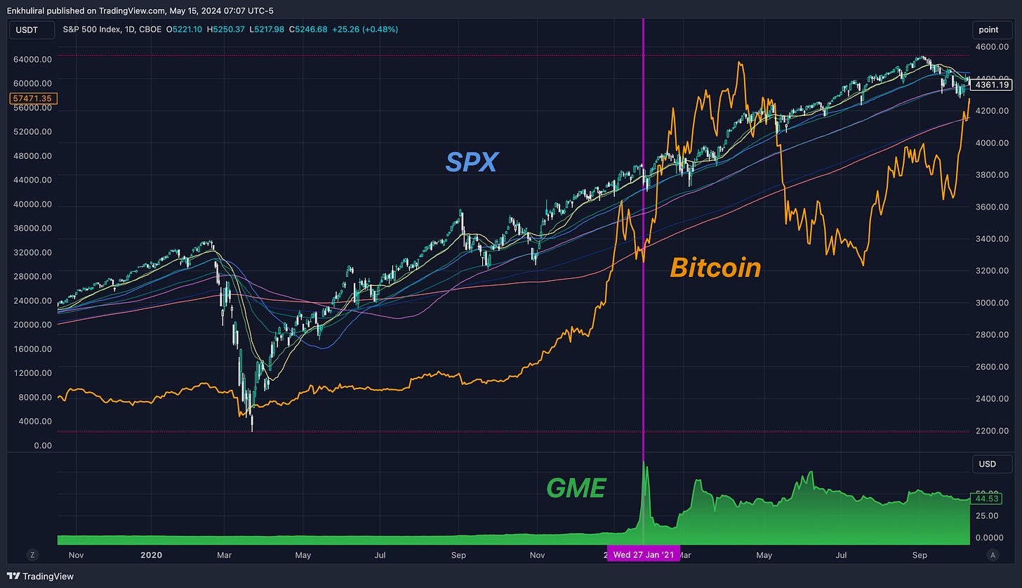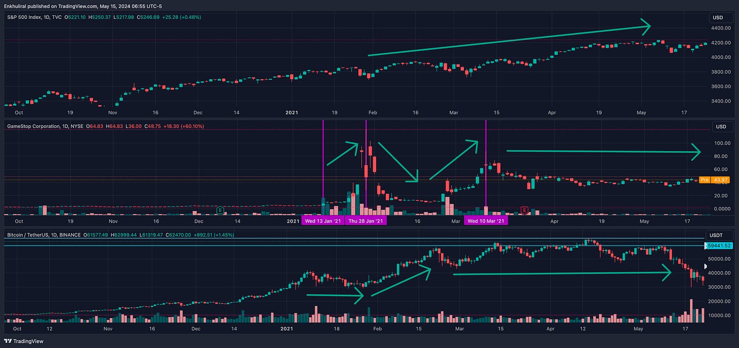 Хувьцаа өсөлттэй байсан бөгөөд крипто эхэндээ хамт өсөхгүй байж байгаад GME эхний том уналт дээр өсөөд буцаад өсөхөөр нь хөндлөн хөдөлгөөн хийсэн байна.