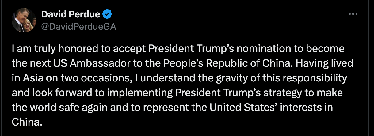 Ерөнхийлөгч Трампын намайг Бүгд Найрамдах Хятад Ард Улсад суух дараагийн Элчин сайдаар нэр дэвшүүлсэнд үнэхээр их хүндэтгэлтэй хандаж байна. Би хоёр удаа Ази тивд амьдарч байсан бөгөөд энэ хариуцлагатай үүргийн ач холбогдлыг ойлгож байна. Ерөнхийлөгч Трампын дэлхийг дахин аюулгүй болгох стратегийг хэрэгжүүлэх, мөн Хятад дахь АНУ-ын ашиг сонирхлыг төлөөлөхөөр урагш тэмүүлэхэд баяртай байна.