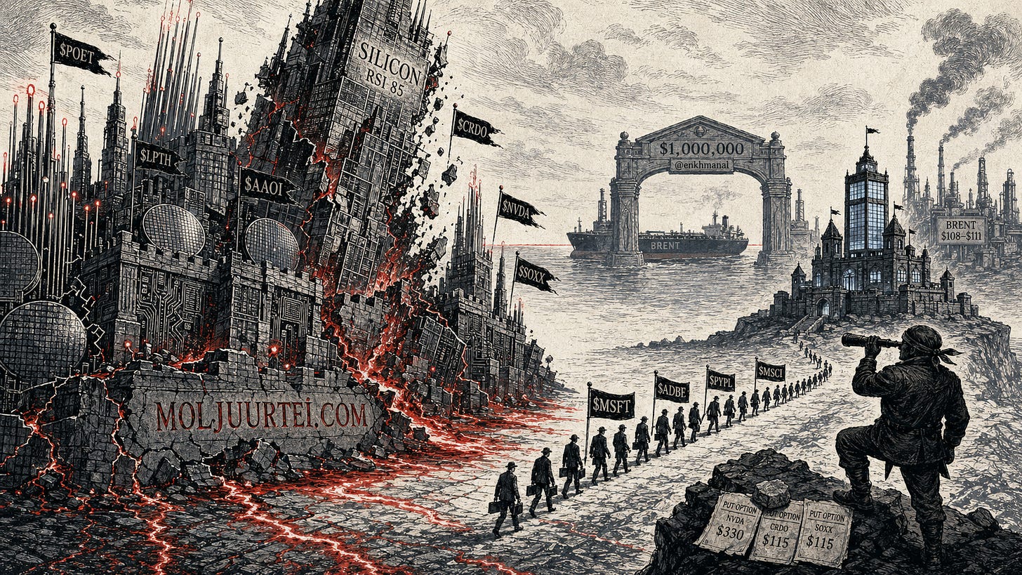 $POET болон Цахиур-Фотон (Silicon-Photonics) чиглэлийн уналт: Marvell $POET-ийн захиалгыг цуцалсан нь бүхэл оптик салбарт нөлөөлж $LITE, $AAOI, $CRDO, $COHR бүгд дагаад унав. Өнгөрсөн долоо хоногийн баатар болсон PhotonCap-ийн “Marvell төхөөрөмжийг нь авсан болохоос материалыг нь биш” гэх таамгийг дахин шалгах хэрэгтэй боллоо. Мөн PhotonCap-ийн бүтэн сайн өдрийн нийтлэл “GPU эрин үе TSMC дээр суурилж байсан бол Inference (дүгнэлт хийх) эрин олон чип үйлдвэрлэгч (foundries) дээр суурилна” гэсэн нь AI чипийн чиг хандлага $POET шиг монополь биш, харин $NVDA, $INTC, $TSM, Samsung, Hynix, $AVGO, $AMD зэрэг олон үйлдвэрлэгч рүү салж байгааг харууллаа.