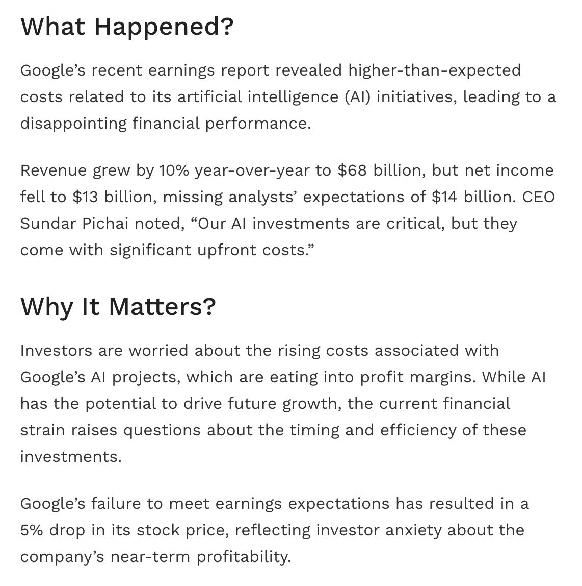 Шинжээчдийн дагуу бол Google-ийн ашиг хиймэл оюун ухааны зардлаас болоод санаснаас доогуур гарсан бөгөөд энэ нь унахад хүргэлээ гэж үзэж байна: