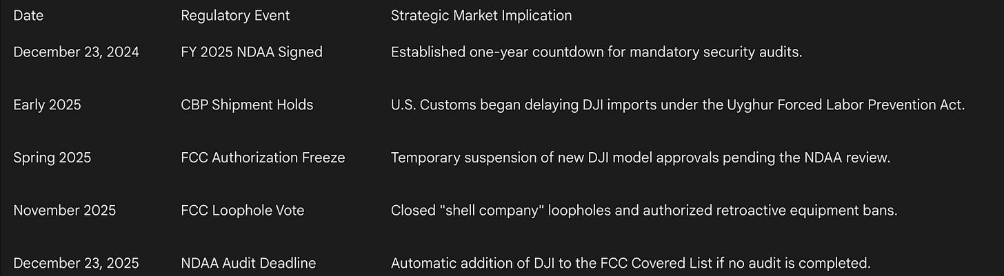 2025 оны 12 сарын 18-нд батлагдсан батлан хамгаалахтай холбоотой хуулийн дагуу, 2025 оны 12 сарын 23-наас эхлэн нэг жилийн дотор хэрэглээний дроны зах зээлийн 90 хүртэлх хувийг эзэлдэг Хятадын DJI компанид аудит хийх ёстой байсан.
