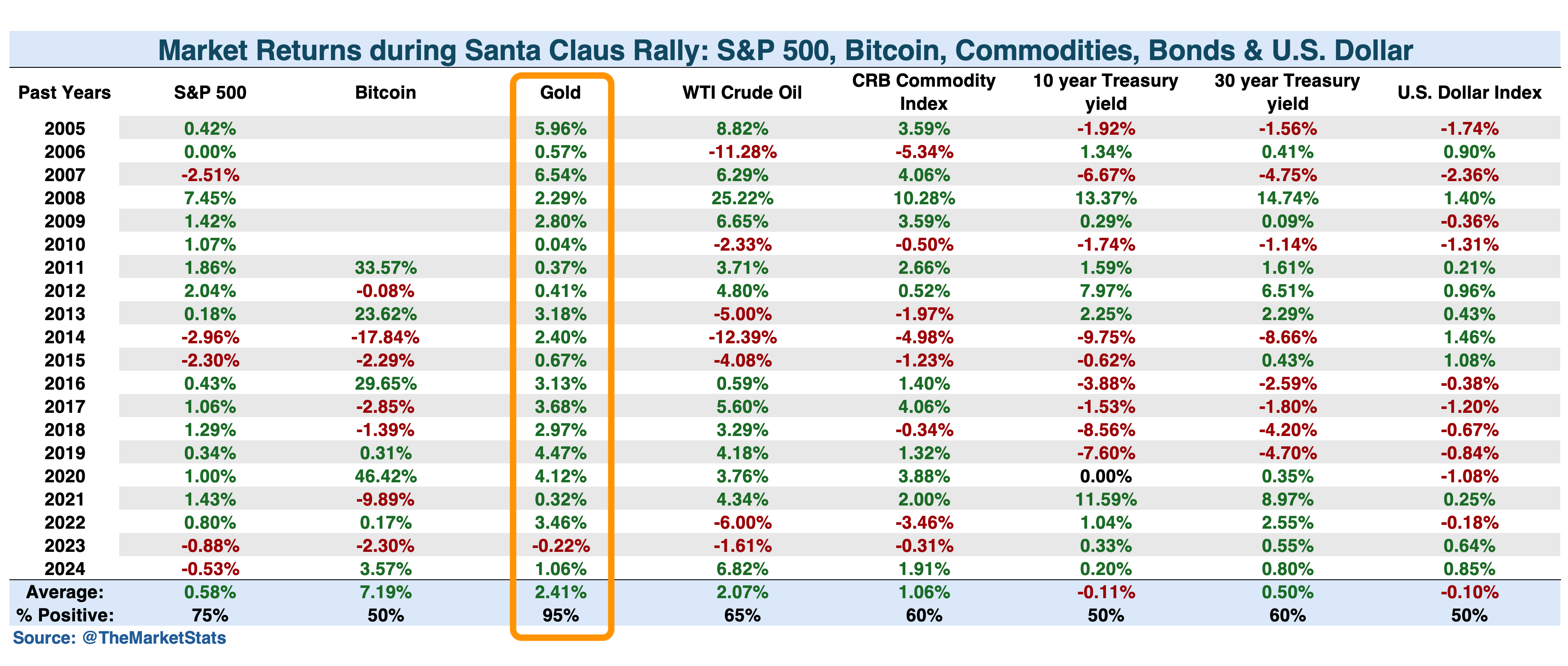Santa Rally буюу жилийн төгсгөлд маркет өсөх хандлагатай гэсэн онол бий. Тэгвэл алт өсөх хамгийн өндөр магадлалтай, дундаж өсөлт хамгийн ихтэй нь Биткойн байдаг юм байна.