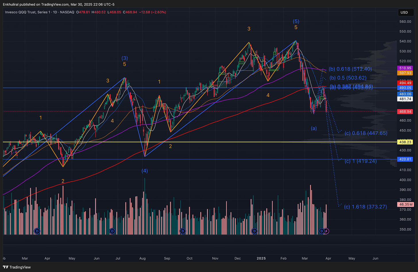 Nasdaq мөн адил 200 SMA-ээ давж чадалгүй rejected болоод уналаа. Fibonacci level харвал QQQ цаашдаа 447, 419, 373 хүртэл унах боломжтой.
