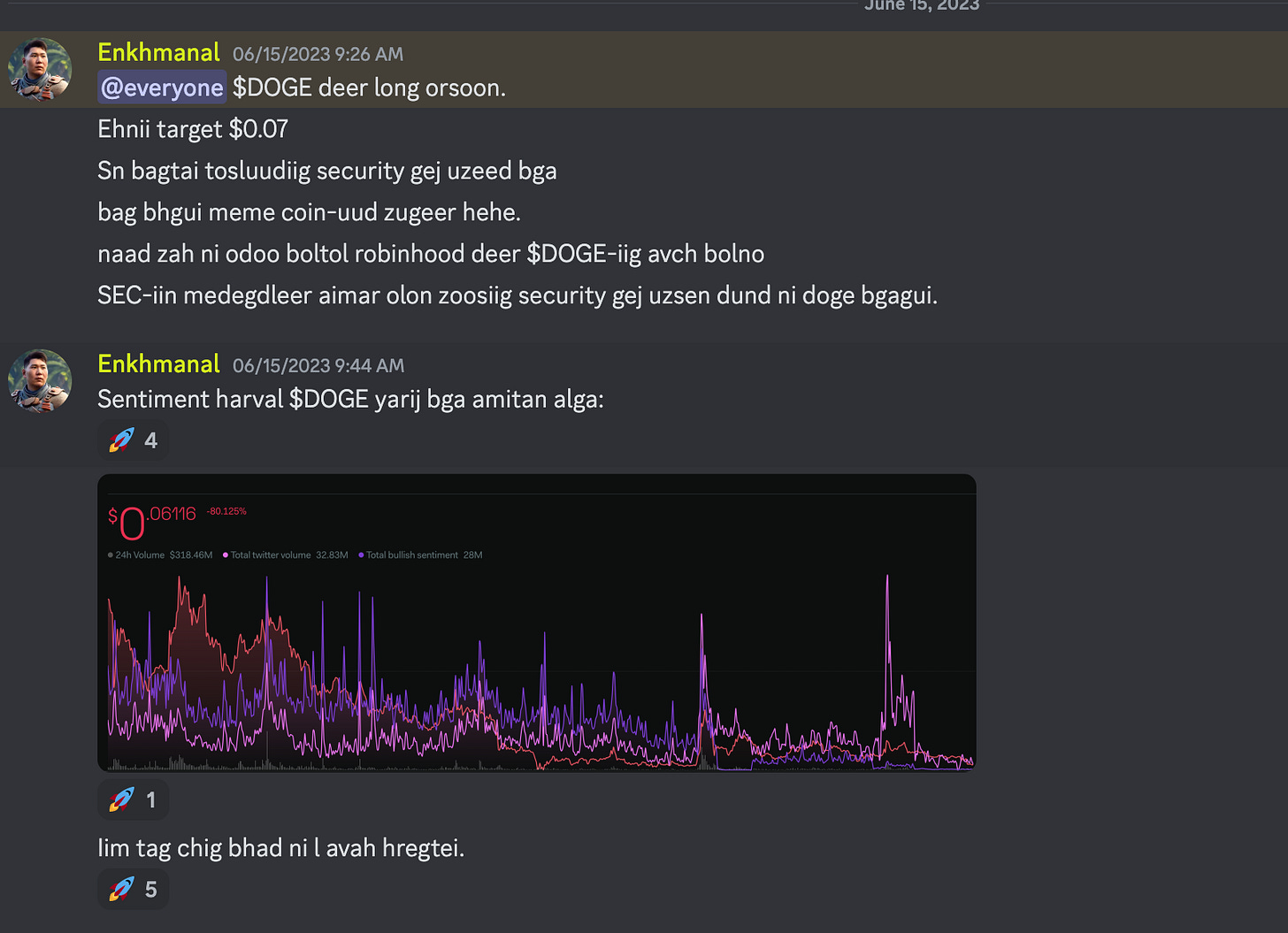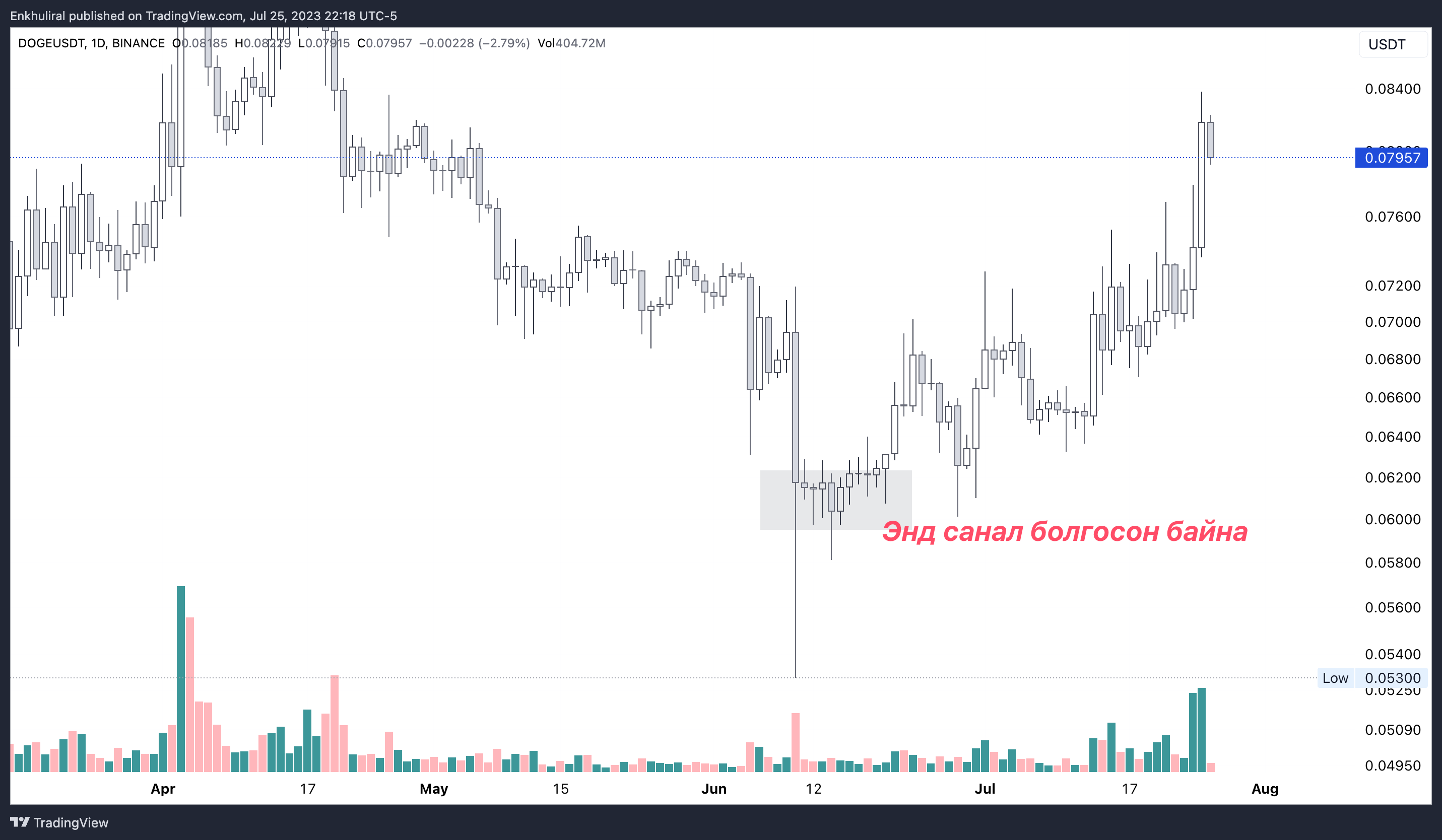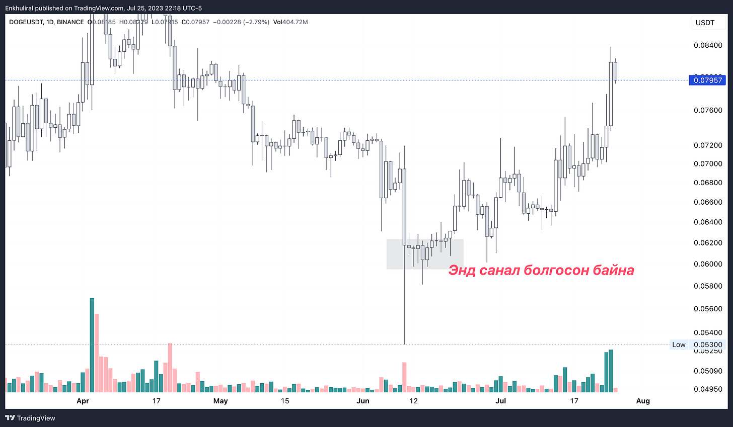 Энэ жилийн хамгийн ёроолын ханш болох 6 цент байхад нь $DOGE авахыг санал болгож байсныг харж болно.